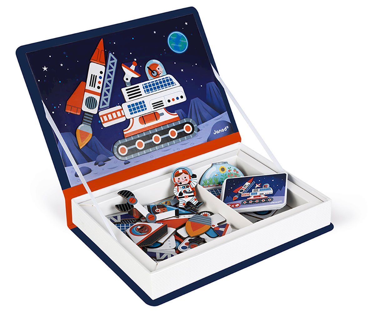 Conosci i Magnéti’book? Questi libri magnetici portatili ed educativi piacciono un mondo a grandi e piccini! Il principio? Una scatola magnetica contiene molti elementi magnetici da associare seguendo i modelli o lasciando spazio alla creatività! Questo gioco magnetico trasporterà i più piccoli a partire dai 3 anni nella paese delle fiabe grazie a 30 magneti e 10 carte modello. Al suo interno, un pannello magnetico permette di ricomporre il personaggio spaziali utilizzando i magneti. Il bambino può anche divertirsi mescolando i diversi pezzi insieme per creare personaggi bizzarri dato che i pezzi sono tutti intercambiabili! Permette al bambino di migliorare la sua immaginazione e la motricità fine. Questo prodotto è realizzato con materiali certificati FSC® e materiali controllati.