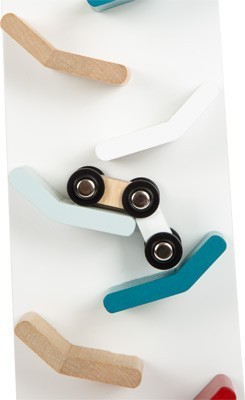 Un giocattolo in legno calmante e affascinante allo stesso tempo! Una volta rilasciata in cima, l’auto snodata corre da sola lungo la pista in un veloce zig-zag e compie rapide capriole. In questo modo ogni discesa diventa un’esperienza e la torre a cascata un’attività di lunga occupazione in cameretta. Grazie ai colori moderni in combinazione con il bianco e il legno naturale, è anche un oggetto decorativo di tendenza!